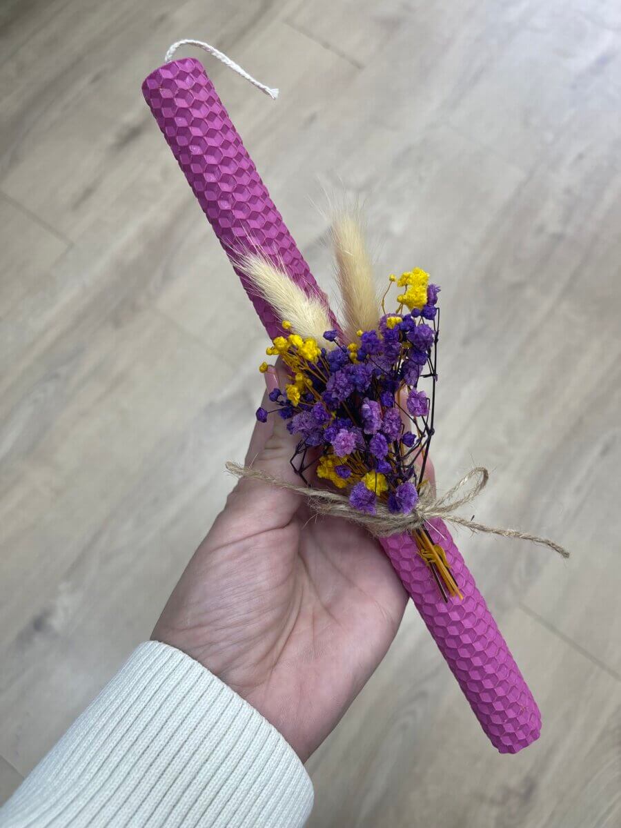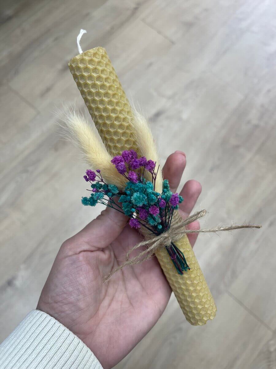 Η λαμπάδα είναι φτιαγμένη από 100% αγνό μελισσοκέρι με ευχάριστο άρωμα μελιού και αληθινά αποξηραμένα λουλούδια.